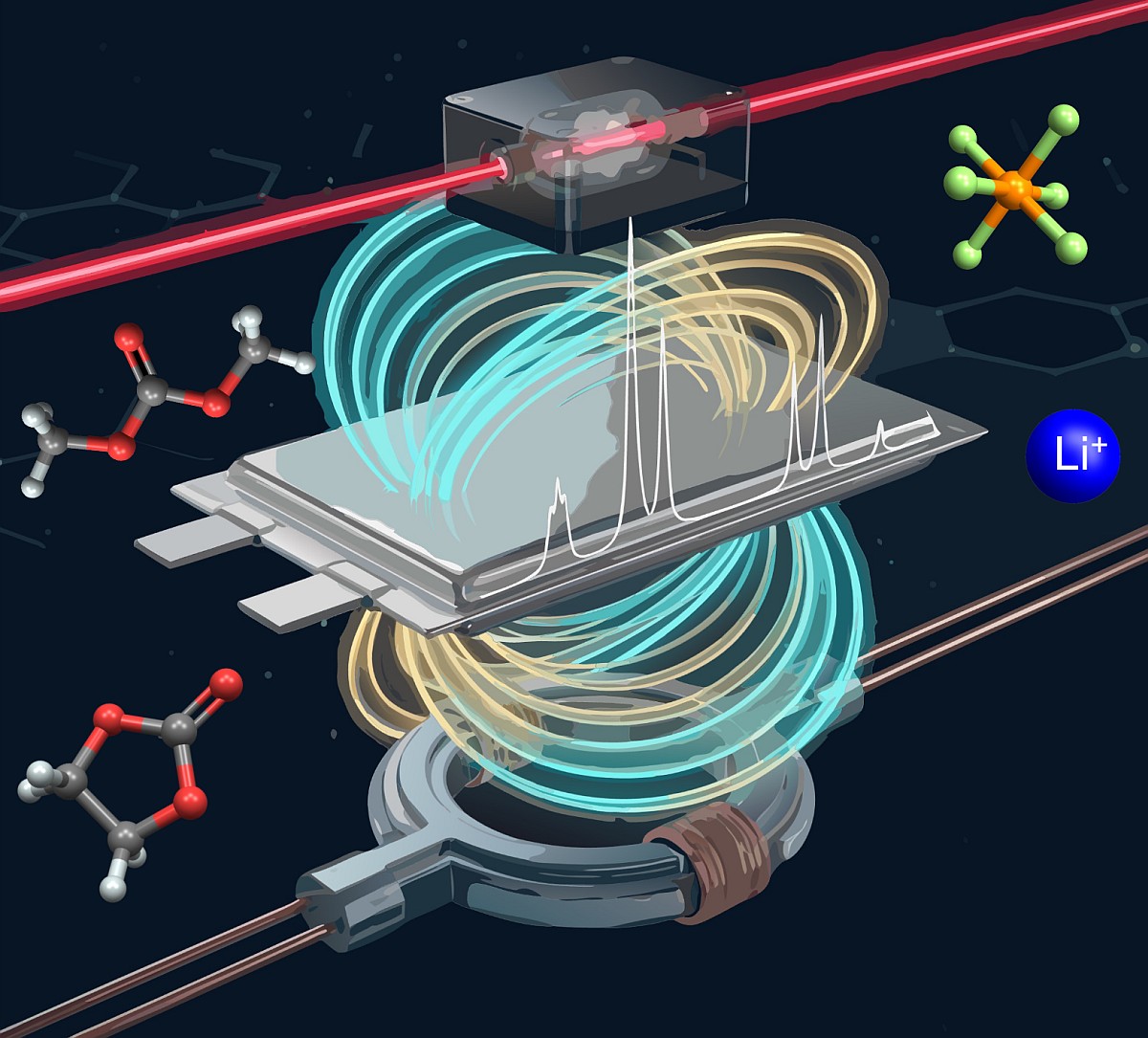 The study introduces an important advance based on zero- to ultralow-field nuclear magnetic resonance (ZULF NMR), using laser-based quantum sensors-optically pumped magnetometers (OPMs)-as detection elements. Unlike conventional high-field NMR, which is strongly limited by the metallic casing of commercial batteries, this approach enables measurements for the first time through the enclosure and makes it possible to quantify both the amount and composition of the electrolyte, including solvent and lithium salt components.
